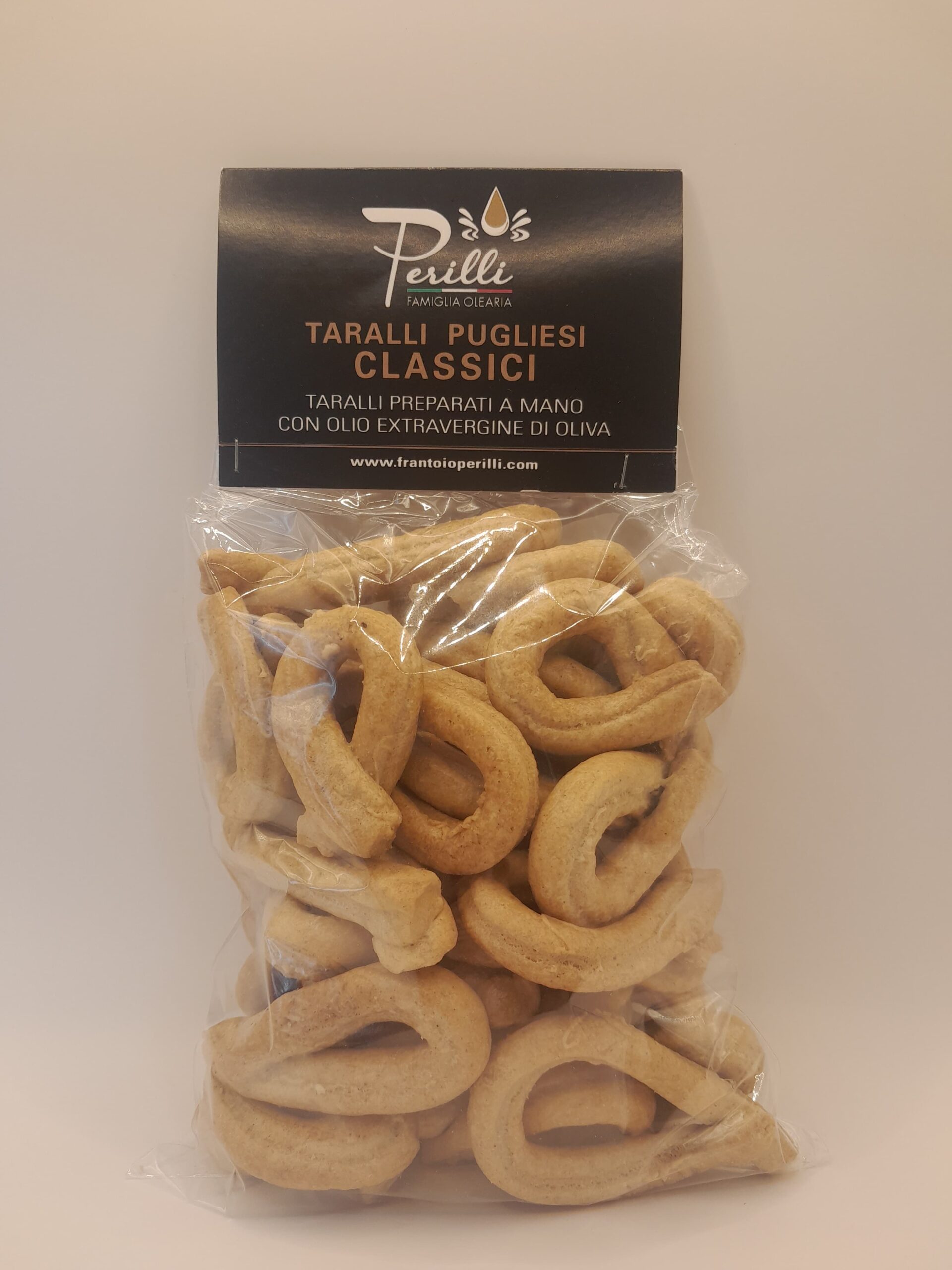Confezione di taralli pugliesi classici preparati a mano con olio extravergine di oliva.